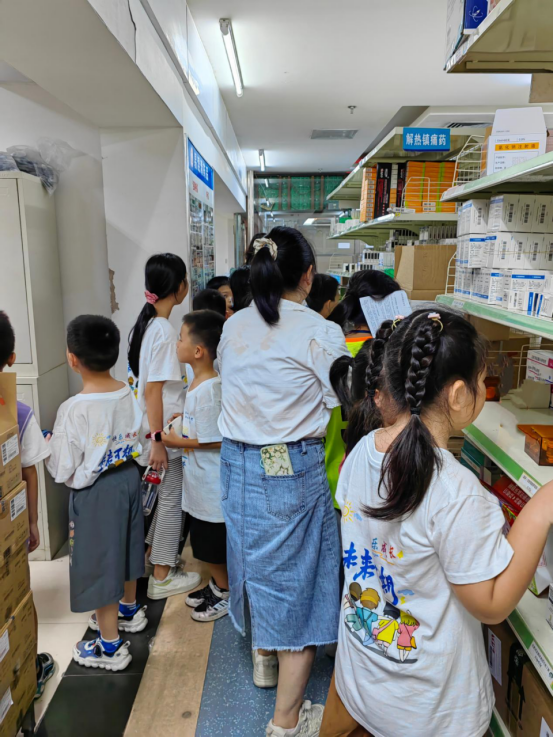 在儿童退烧药药架前,孩子们通过互动问答,辨识了甲类和乙类OTC药品,并学习了如何查看药品的批准文号。
