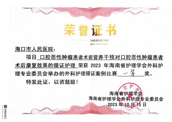 该案例取材于黄春珍护长的2016年立项的海南省卫生厅课题“口腔恶性肿瘤患者术前营养干预对口腔恶性肿瘤患者术后效果的研究”,并于2019年已顺利完成结题。2019年2月黄春珍护长于《中国实用护理》发表论文《口腔恶性肿瘤患者术前营养干预对口腔恶性肿瘤患者术后效果的研究》,获优秀论文奖。科室接到护理部通知后,立即成立了循证护理小组(黄春珍、伍禅璐、董婷婷、郭丽婷),讨论选题,最终确定了选用该案例,明确小组各成员的具体分工,通过大家的团结协作,集思广益,在护理部的大力支持与帮助下,斩获佳绩,口腔颌面外科护理团队将戒骄戒躁,砥砺前行!