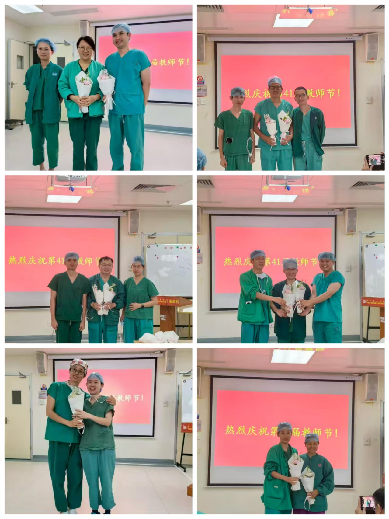 科室的年轻医师、研究生和住院医师代表们手捧精心准备的鲜花,依次走到各位导师面前,深深鞠躬,献上鲜花与祝福。“老师,您辛苦了!”“祝老师节日快乐!”一句句简单而真挚的话语,表达了学员们最深的敬意与感激。老师们脸上洋溢着幸福和欣慰的笑容,现场气氛温馨感人。